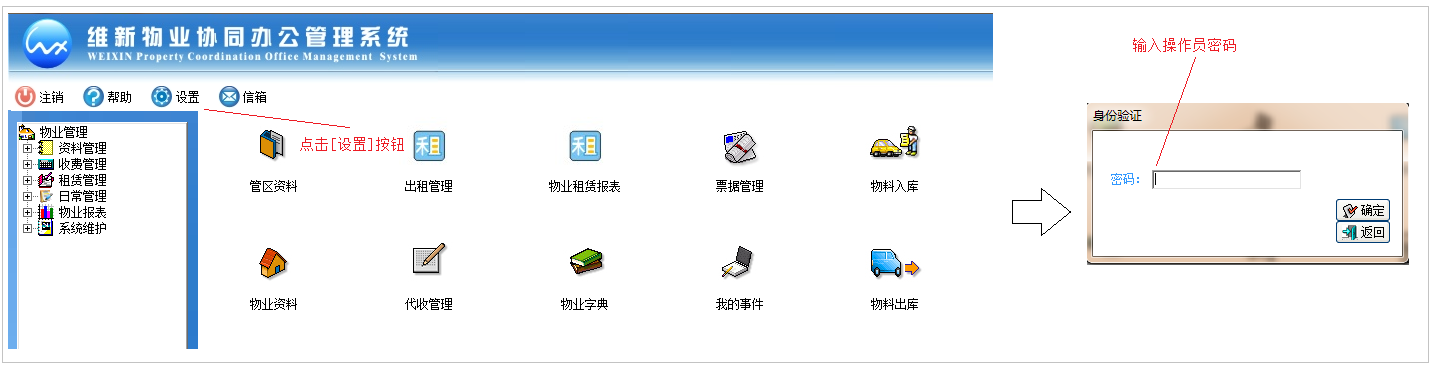 軟件主頁面的我的工作臺(tái)是由用戶自己設(shè)置的,在此簡單說明如何設(shè)置。首先點(diǎn)擊主頁面左上方[設(shè)置]按鈕就會(huì)彈出密碼驗(yàn)證窗口,輸入操作員自己的密碼,就會(huì)進(jìn)入設(shè)置窗口,如圖: