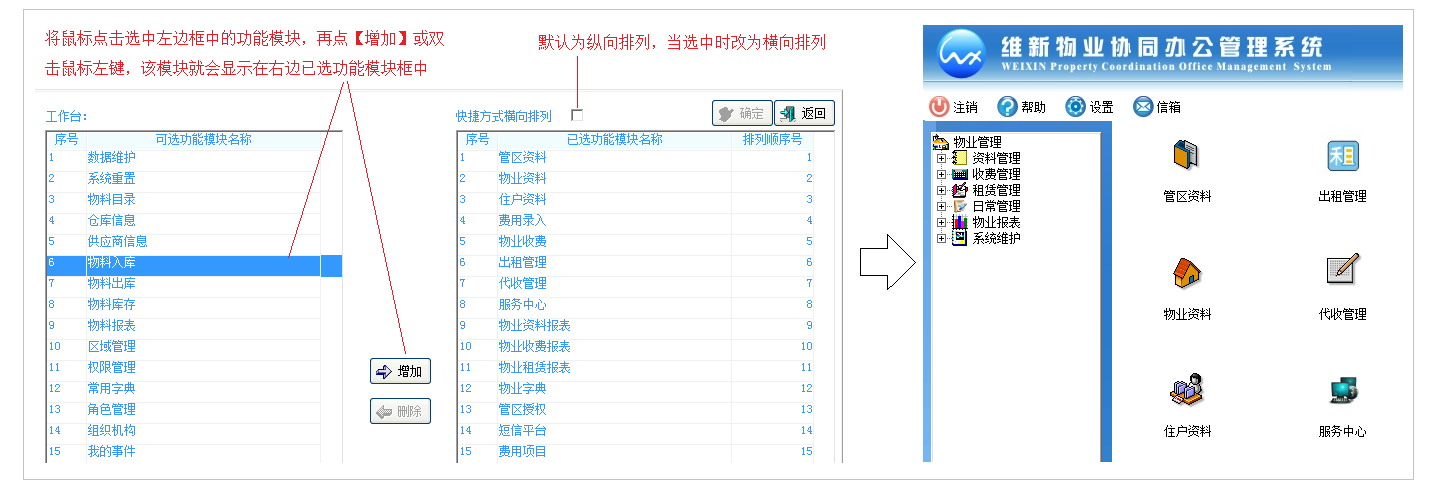 在設(shè)置窗口中,將需要在我的工作臺(tái)顯示的功能模塊從左邊功能模塊框增加到右邊已選功能模塊框中。其中右邊框中的功能模塊默認(rèn)按‘排列順序號(hào)’縱向排列,當(dāng)選中‘快捷方式橫向排列’時(shí),則按‘排列順序號(hào)’橫向排列,如圖: