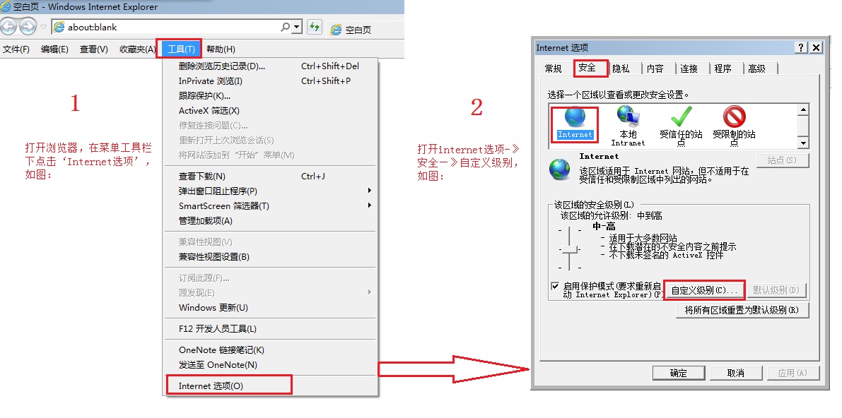 | 計(jì)算機(jī)使用不同的瀏覽器以及瀏覽器版本不同,表現(xiàn)出來的問題提示略有差異,以上提示是在IE瀏覽器獲得。下面就以IE瀏覽器為例,簡單說明初次使用維新物業(yè)協(xié)同辦公管理系統(tǒng)WEB版的瀏覽器設(shè)置: